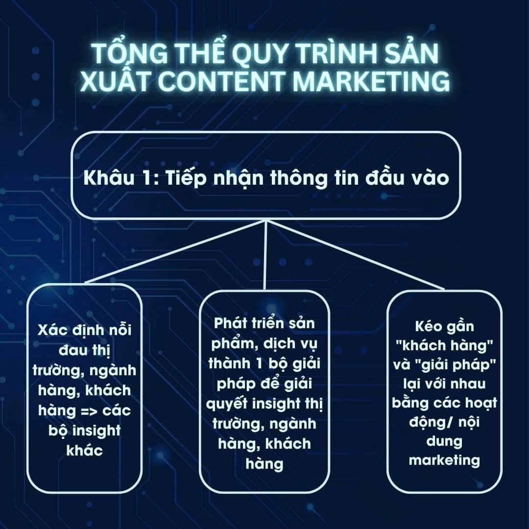Ở khâu 1: tiếp nhận thông tin đầu vào, chính là câu chuyện tìm hiểu, nghiên cứu các thông tin về thương hiệu, công ty, giải pháp, sản phẩm, dịch vụ, thị trường, ngành hàng, đối thủ để hình thành nên bức tranh tổng quan.