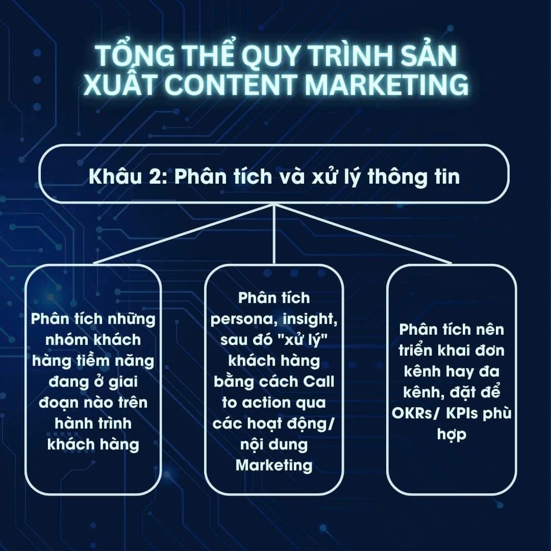Ở khâu 2: phân tích và xử lý thông tin, chính là câu chuyện phân tích xem thử những nhóm khách hàng tiềm năng lớn nhất của mình đang ở giai đoạn nào trên hành trình khách hàng, persona họ như thế nào, insight họ như thế nào, sau đó "xử lý" khách hàng bằng cách Call to action họ đến với giai đoạn tiếp theo trên hành trình khách hàng. Thường sẽ qua những giai đoạn: chưa biết insight, có insight nhưng chưa biết giải pháp, biết nhiều giải pháp khác nhau trong đó có giải pháp bên mình, thích giải pháp bên mình, tin giải pháp bên mình, dùng thử giải pháp, mua giải pháp, cuối cùng là yêu và sau đó là trung thành với giải pháp.